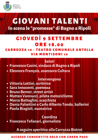 Primo appuntamento con le “promesse” del territorio giovedì 9 settembre alle 18 alla Carrozza 10 al Teatro comunale di Antella. Presenti anche la campionessa di nuoto, il “re” degli scacchi e la scrittrice