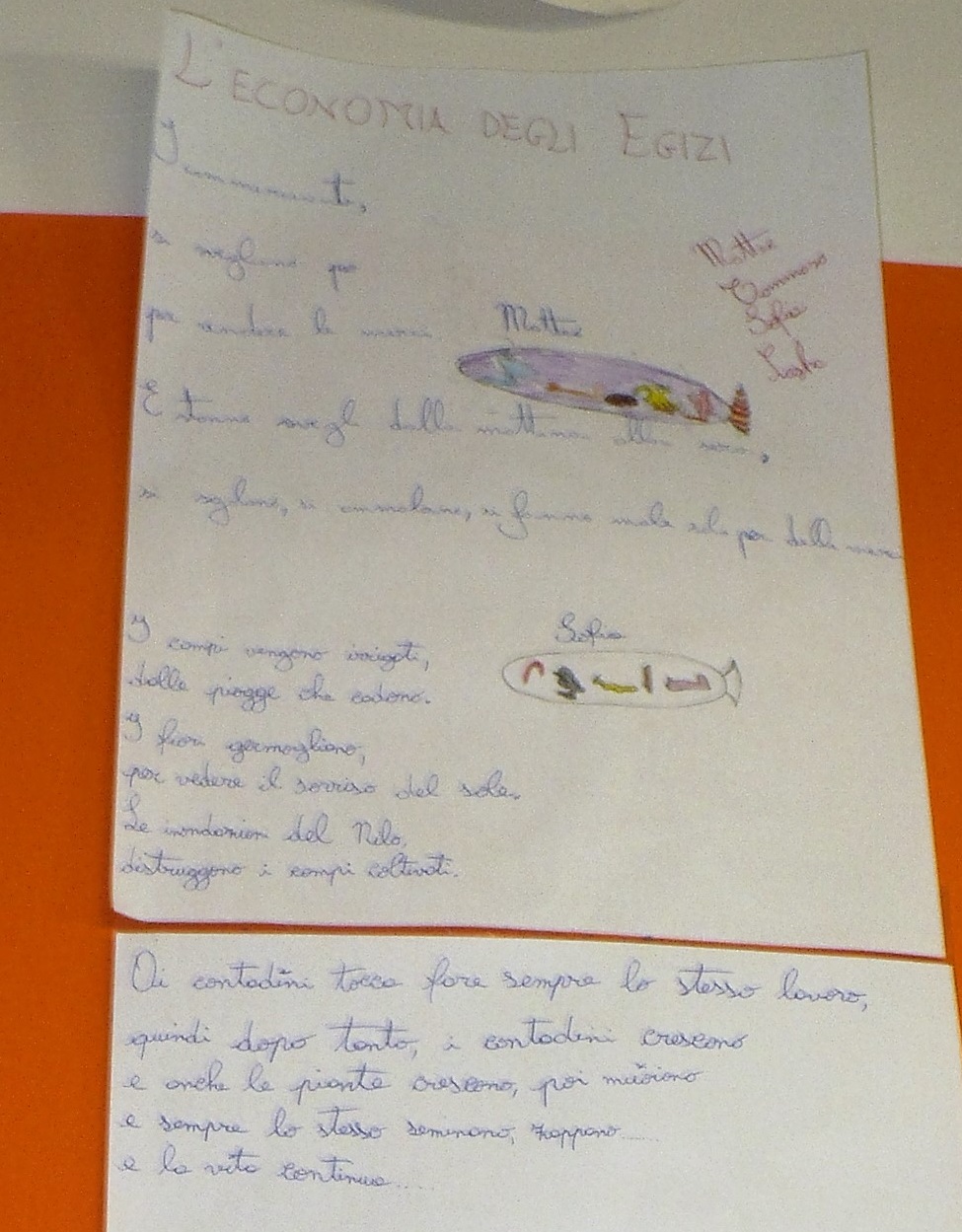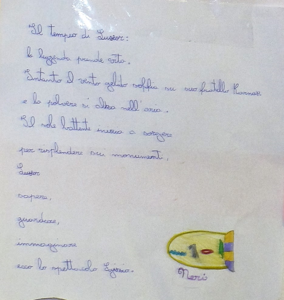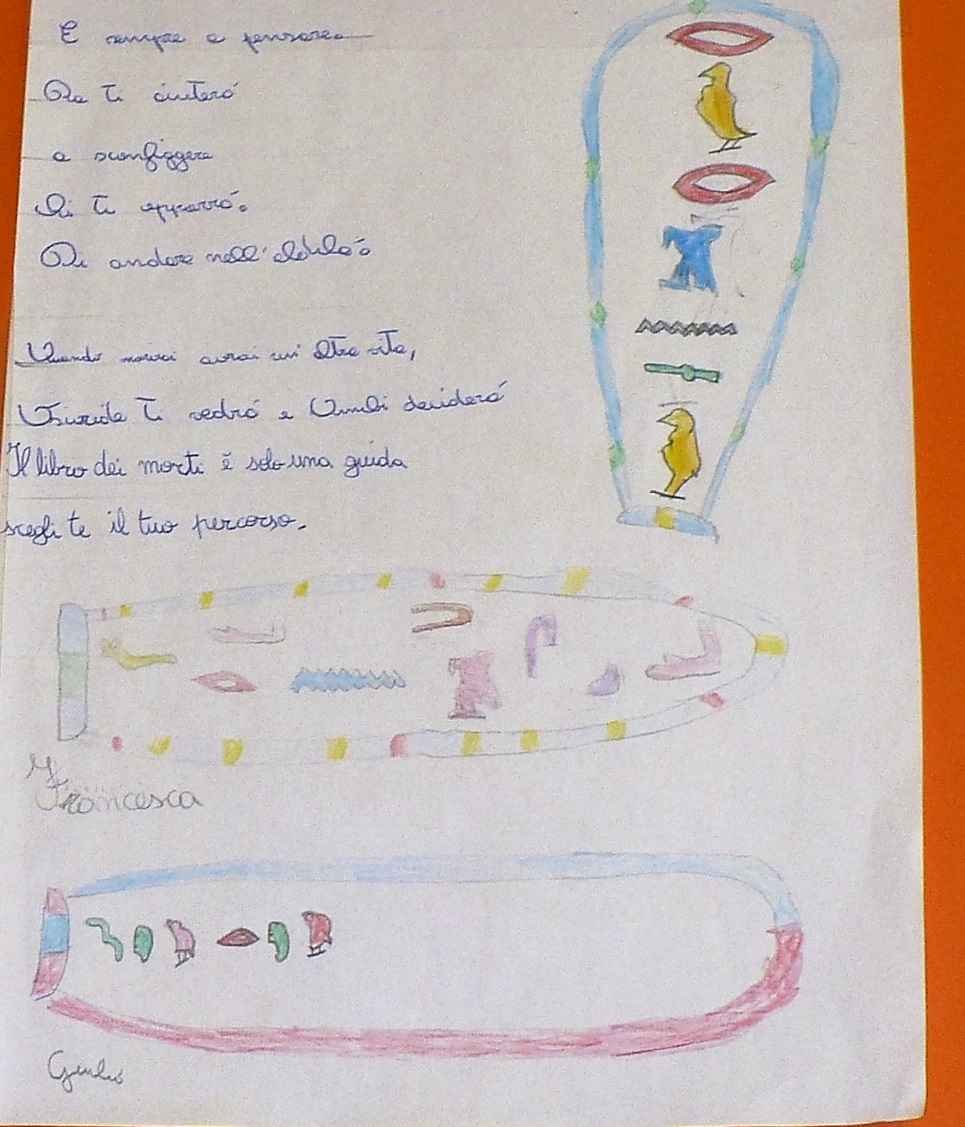 Nel corso dell'anno scolastico, i bambini della classe quarta A si sono dedicati ad un lavoro di ricerca di gruppo sulla civiltà dell'antico Egitto. A conclusione del materiale raccolto hanno scritto delle poesie sugli argomenti da loro trattati: i monumenti, il territorio e le dinastie dei faraoni, l'economia, la cultura, la vita quotidiana, la religione, l'organizzazione sociale. La tecnica utilizzata è stata quella della poesia di gruppo (xeropoesia) che si avvale dell'uso di varie figure retoriche: la rima, la similitudine, l'onomatopea, la metafora, la personificazione, l'anafora.