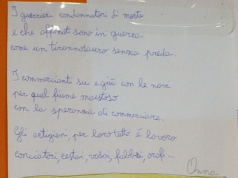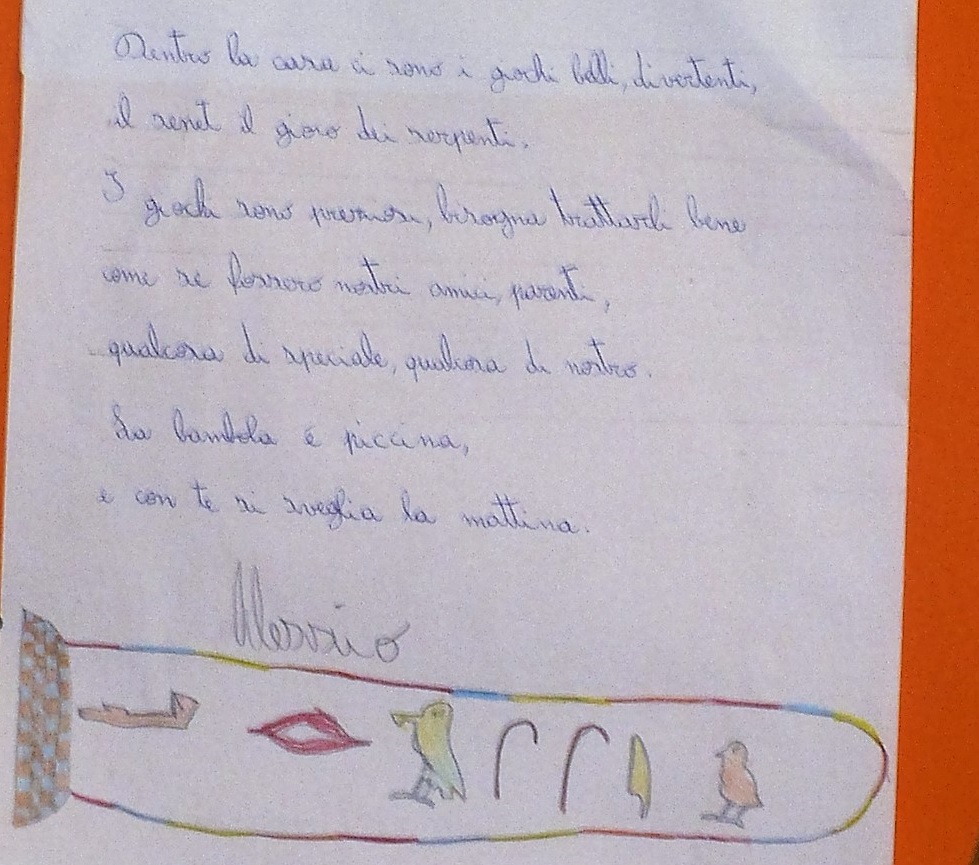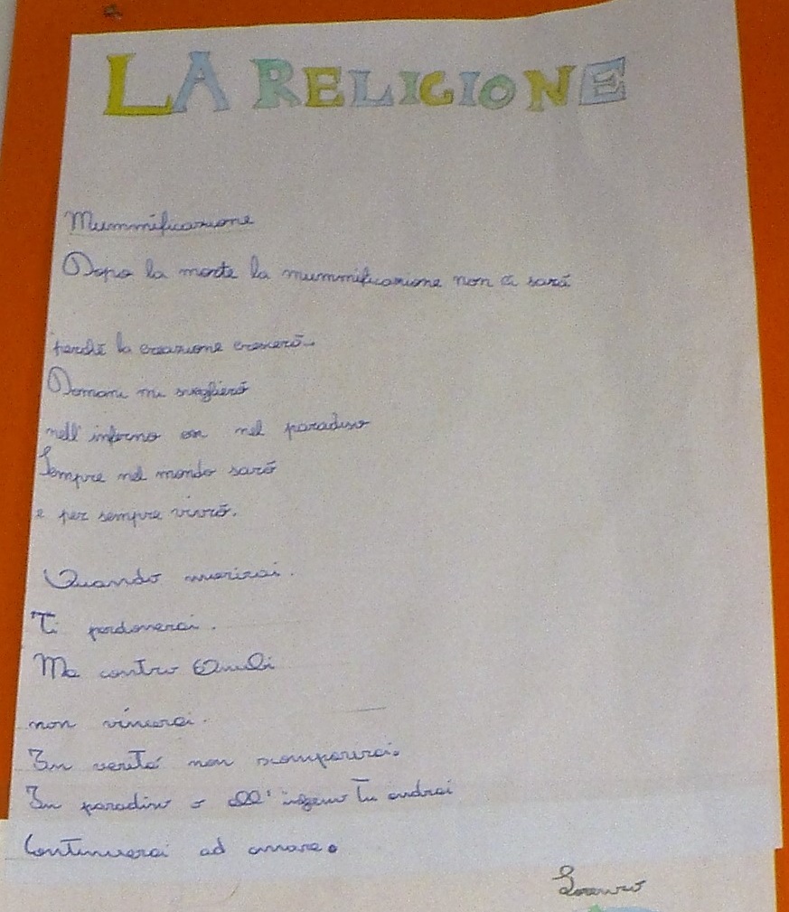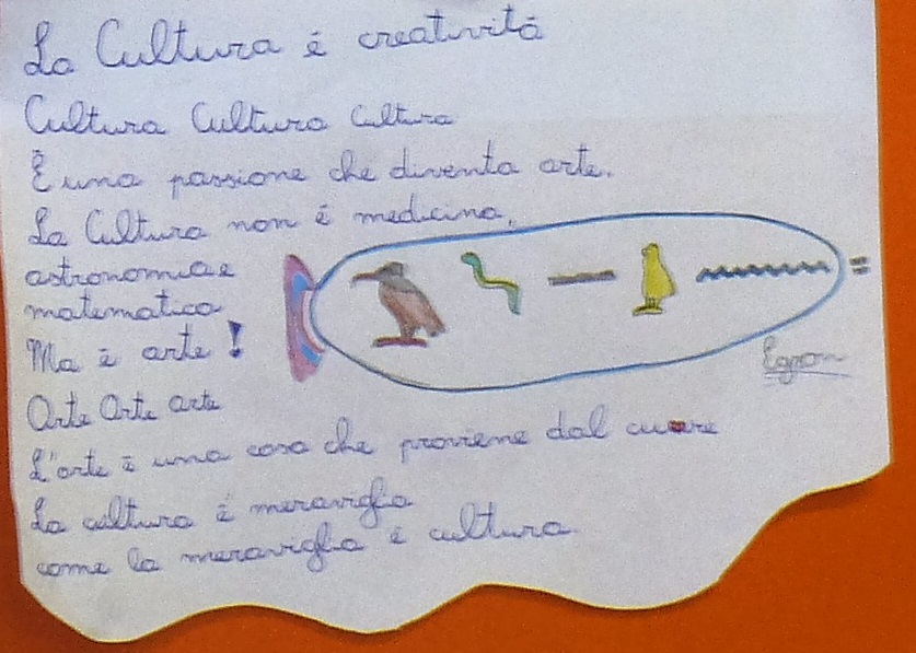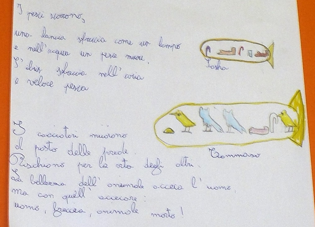 Nel corso dell'anno scolastico, i bambini della classe quarta A si sono dedicati ad un lavoro di ricerca di gruppo sulla civiltà dell'antico Egitto. A conclusione del materiale raccolto hanno scritto delle poesie sugli argomenti da loro trattati: i monumenti, il territorio e le dinastie dei faraoni, l'economia, la cultura, la vita quotidiana, la religione, l'organizzazione sociale. La tecnica utilizzata è stata quella della poesia di gruppo (xeropoesia) che si avvale dell'uso di varie figure retoriche: la rima, la similitudine, l'onomatopea, la metafora, la personificazione, l'anafora.